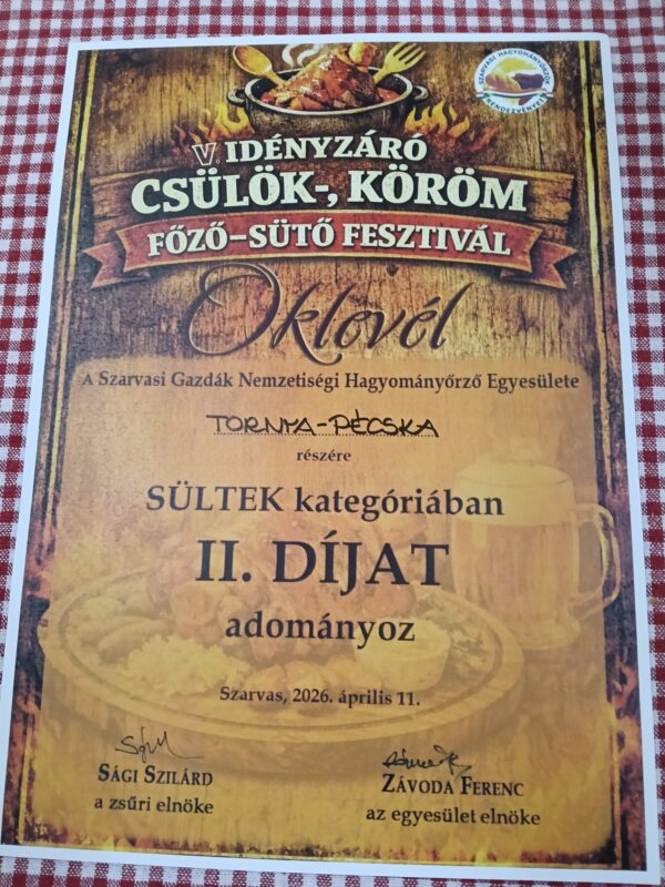 Két évtizede nincs olyan gasztronómiai fesztivál – Romániában vagy Magyarországon – ahonnan a ProPir Kult Egyesület fémjelezte Pécska-Tornya csapat ne tért volna haza valamilyen díjjal. Ezúttal Szarvasról – ahova már hazajárnak – az V. Idényzáró Csülök-Köröm Főző-Sütő Fesztiválról hozták el a második helyezést a sültek kategóriában.